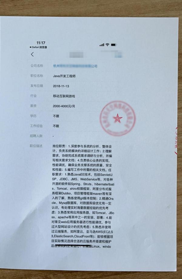 虞先生向记者提供的公司招聘信息显示,该公司曾于2018年11月13日发布,招聘“Java开发工程师”的薪资为每月2000元至4000元。他提到,工作内容在2021年、2022年曾进行过修改,但薪资一直未修改。虞先生还提到,某招聘平台的招聘信息是在4月21日之前发布的。
