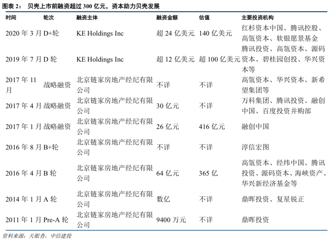 2019年3月25日,贝壳启动D轮融资获得腾讯8亿美元,以及微信九宫格流量入口享京东同等待遇,但有趣的是,据一位参与贝壳D轮募资内部人士指出,D轮估值95亿美元,相比上一轮反而缩水了35亿美元,看来资本信心严重不足。