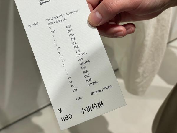 店内最受欢迎的一款产品是价值680元的高腰阔腿裤,这一价格在“巨富长”零售品牌中着实不高。产品的标签上,“面料120元”“设计30元”“工费95元”等字样赫然在目,就连4元的拉链成本也被详细标出,很有特色。“通常这样一条裤子的定价是成本的6倍,但我们现在的定价只是成本的2至3倍甚至更低。”“小着”运营负责人肖玥说。