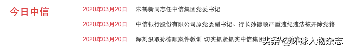 值得注意的是,3月20日,在朱鹤新履新的当天,中纪委网站公布公告,对中信集团旗下中信银行原行长孙德顺立案审查调查,开除党籍;按规定取消其享受的待遇;收缴其违纪违法所得;将其涉嫌犯罪问题移送检察机关依法审查起诉,所涉财物随案移送。