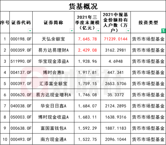 这两只产品,分别为天弘基金旗下的余额宝,以及易方达旗下的易理财,其2021年9月底的规模分别为7635.78亿元和2429.08亿元,两只基金2021年中报披露的持有人户数则分别为7.12亿户、3162.30万户。