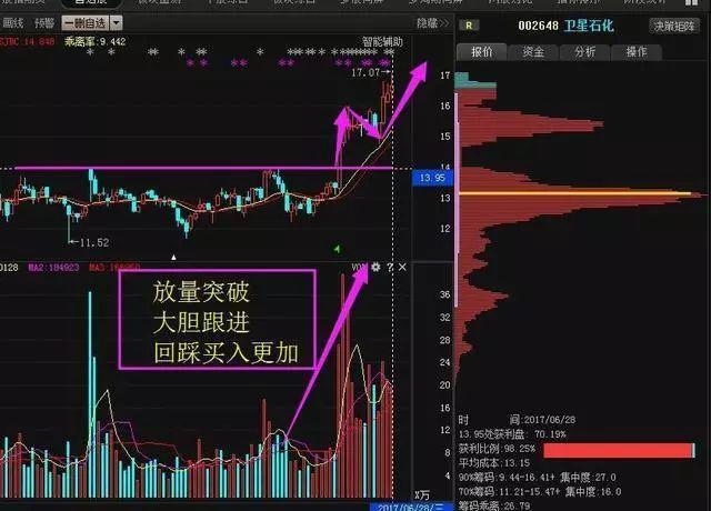 我们拿近期的中兴通讯举例,股价在前期以放量的阳线突破前期箱体的压力,筹码峰低位集中,说明股价主升浪的空间被打开,随后我们可以看到股价一路的飙升,所以接下来大家看到有个股是以放量阳线突破平台压力的话记得多关注可能会有意想不到的收获。同样我们可以看到最近案例卫星石化不就是这样选出来的么,这就是技术分析的作用。