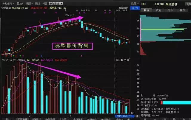个股经历一波较大涨幅后,股价已经处于高位,股价继续向上拉升,但是成交量却没有继续放大反而不断萎缩充分表明股价上攻的动能已经被消化,就像汽车油箱见底一样,这时候坚决卖出不要犹豫,拿西部建设举例,3月份一波上涨,股价在高位缓慢拉升的过程我们可以看到成交量不断萎缩很典型的量价背离这时候我们就要注意规避风险了。