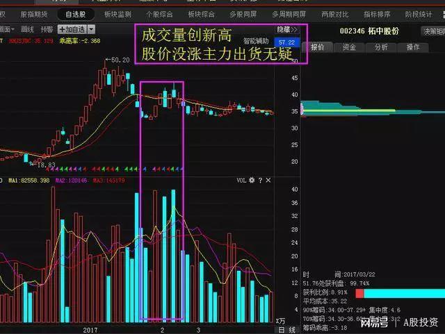 个股经历一波较大涨幅后,股价已经处于高位,但成交量不断增加,股价却一直停滞不前,表明此时已经出现高位量增价平的现象,大概率是主力开始出货,说明获利盘套现锁定利润的意愿已非常坚决,投资者应该及时离场。前期的老妖股柘中股份,在第一波拉升之后,第二波反弹成交量创新高,但是股价却没怎么涨反而在高位震荡,典型的主力出货,随后我们看到股价一路阴跌套牢不少股民。