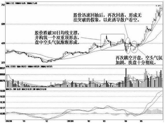首先,由于主力的积极介入,原本沉闷的股票在成交量的明显放大推动下变得活跃起来,出现了价升量增的态势。然后,主力为了给以后的大幅拉升扫平障碍,不得不将短线获利盘强行洗去,这一洗盘行为在K线图上表现为阴阳相间的横盘震荡,同时,由于主力的目的是要一般投资者出局,因此,股价的K线形态往往成明显的“头部形态”。
