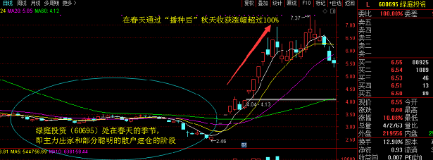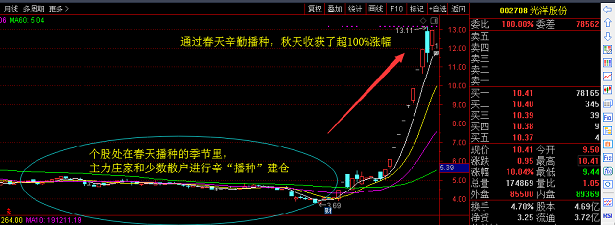 我们再来看上图这只股票:光洋股份(002708)在2018年8月到10月,也就是在底部画圆圈部分,大概2个月时间。主力庄家和少部分有眼光的散户收获超100%涨幅。