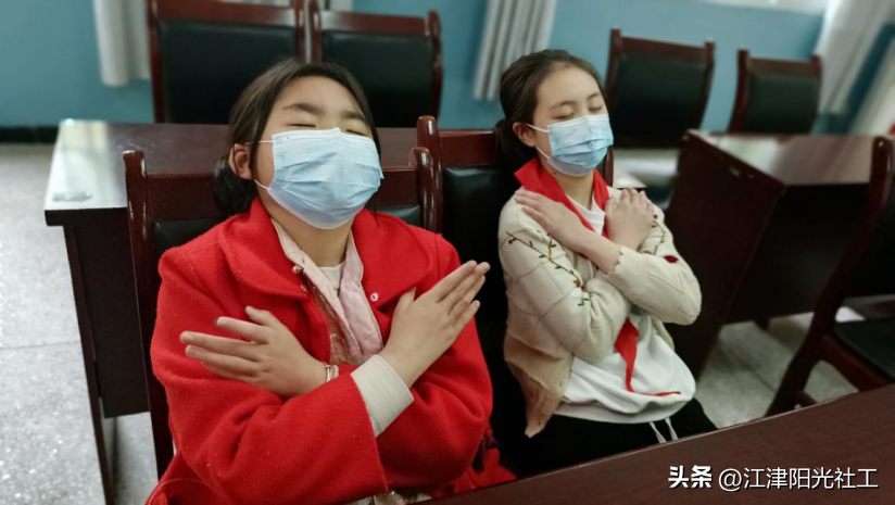 最后,社工和孩子们一起体验心理稳定技术——“蝴蝶拍”,告诉孩子们在不开心的时候可以通过这样的方法稳定自己的情绪。
