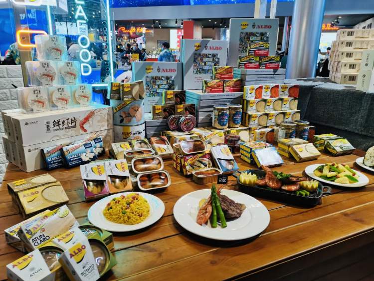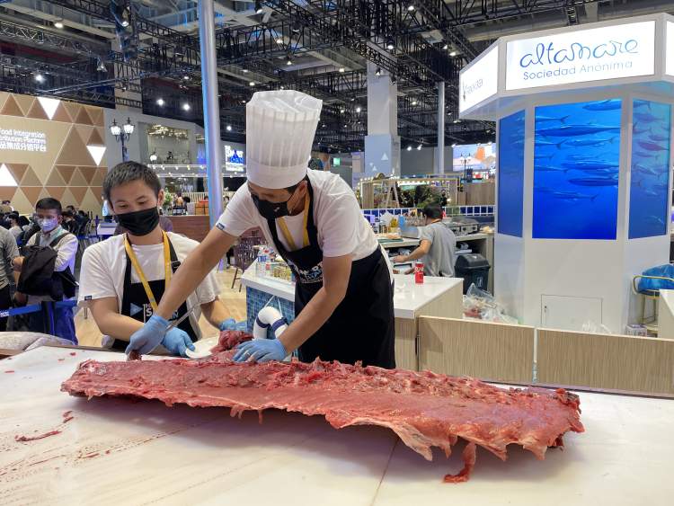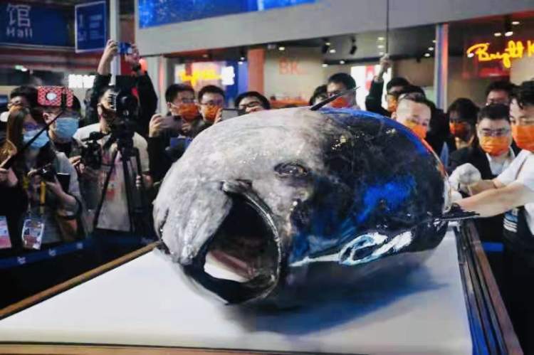 水产集团立足“阿尔博”、“阿特玛”和“FCS”三家境外参展企业,围绕“高蛋白•鲜生活”的参展主题,举办“鲜品秀”、“鲜味馆”、“鲜渔市”、“鲜到家”四大主题活动,包括“蓝鳍金枪鱼开鱼秀”、现场导览互动、美食烹饪和美食品鉴等多个环节,展示“渔场”到“市场”,“展品”到“餐品”的全过程。西班牙ALBO公司将一条“超级鱼王”——体重达700余斤的冰鲜蓝鳍金枪鱼,在这里华丽登场,其全鱼解体,夺人眼球,火爆全场,更是成为难忘的“进博记忆”。蓝鳍金枪鱼是金枪鱼家族中,堪称劳斯莱斯,它的肉质细嫩,油脂丰富,呈淡红色,口味极佳,价格昂贵,主要用于制作高档生鱼片的品质食材,近年来,国内消费市场份额在不断增加,是最受欢迎的美味营养食品之一。